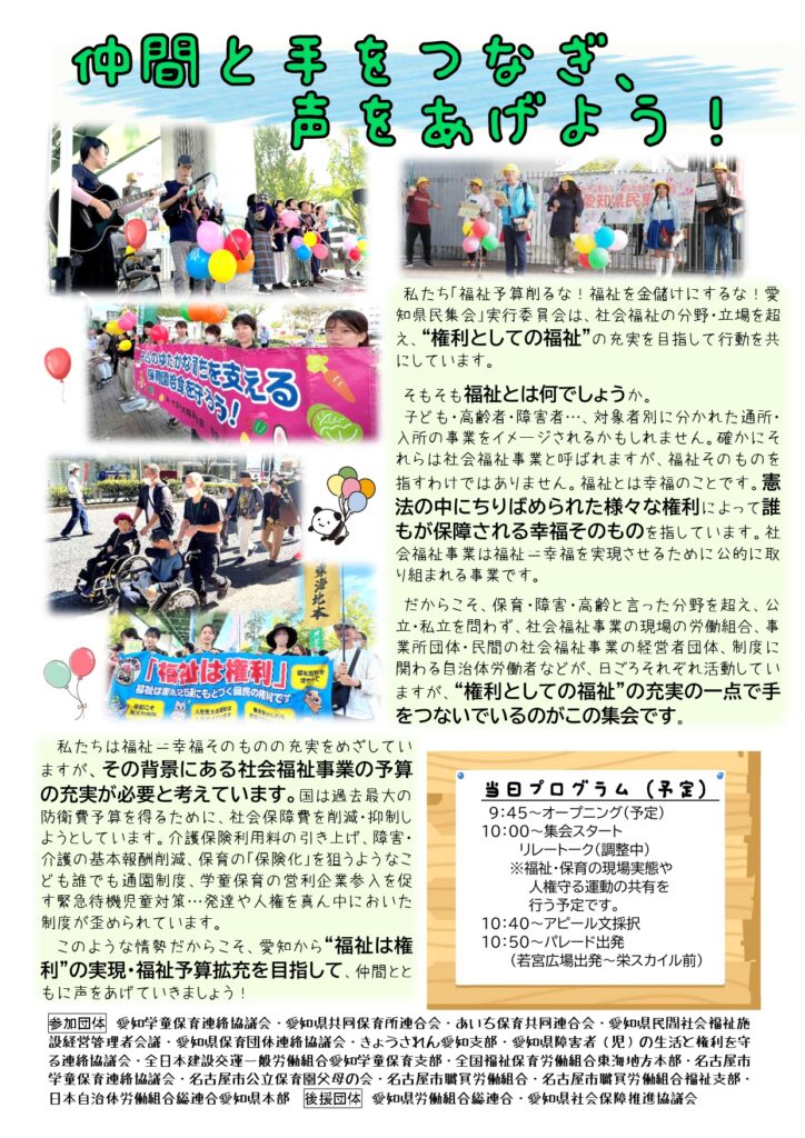 愛知県民集会のお知らせ 投稿日 2025年9月25日 著者 あいされん広報委員 カテゴリー 運動 愛知県民集会が今年も行われます。場所は若宮大通り公園 若宮広場です。10時より集会が行われ、その中では様々な立場の方が現状や運動について熱く語ってくれます。10時50分からはパレードも行い、栄のスカイル前までアピールしながら進みます。一歩でも一緒に歩きましょう!